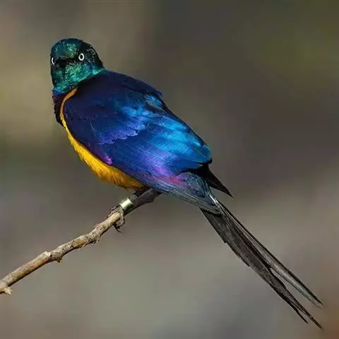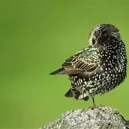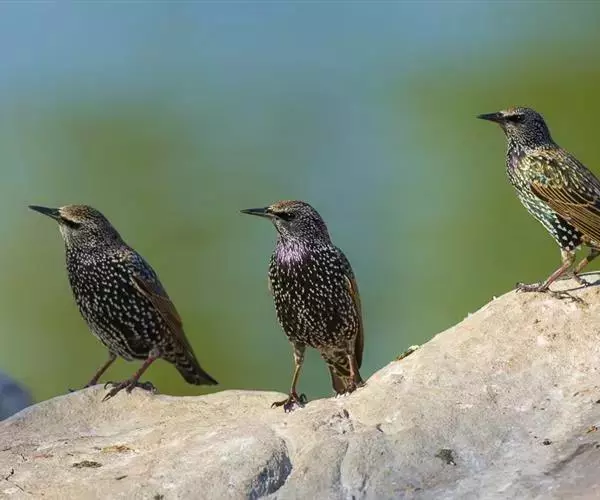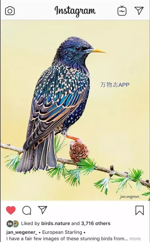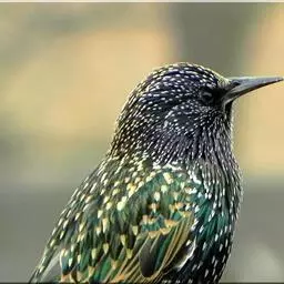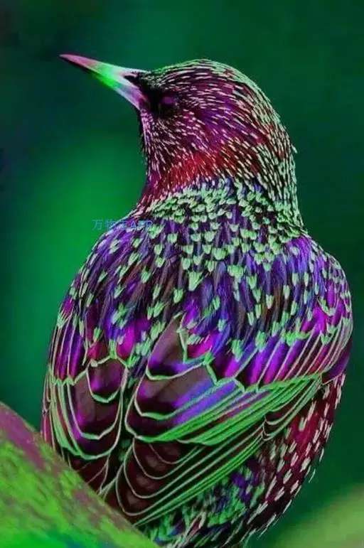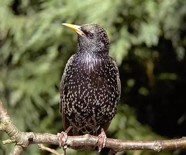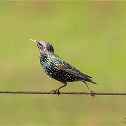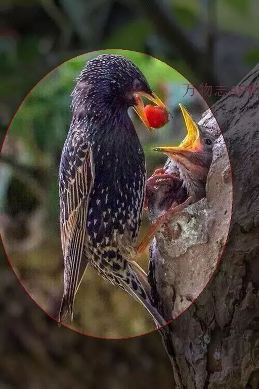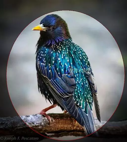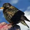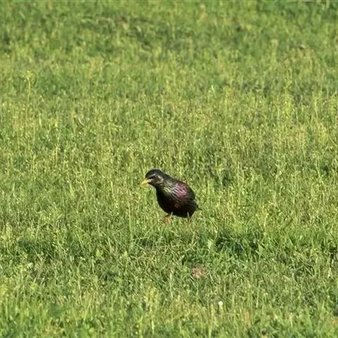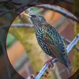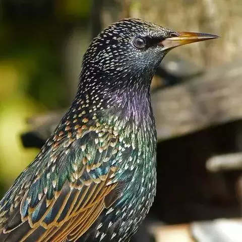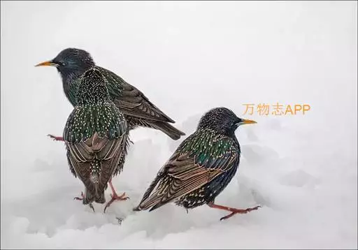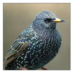 紫翅椋鸟(学名:Sturnus vulgaris):全长约20-24厘米,是中等体型的椋鸟。体羽新时为矛状,羽缘锈色而成扇贝形纹和斑纹,旧羽斑纹多消失。闪辉黑、紫、绿色。具不同程度白色点斑。虹膜深褐色;嘴黄色;脚略红。
