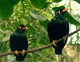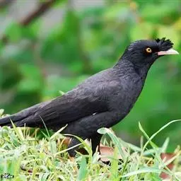 黑冠椋鸟:中等体型的椋鸟,体长21厘米。雄鸟前头为黑色并具金属光泽;头顶、颈项和羽冠亦为黑色;翅及翅上覆羽黑色;尾羽褐色,具白色端斑;上体灰色;下体淡黄褐色。雌鸟形态与雄鸟相似,但羽冠较雄鸟为短。虹膜蓝白或乳黄色;嘴峰铅绿色;跗蹠及爪柠檬黄色。头具黑色羽冠,与其他椋鸟易于区别。主要栖息于开阔落叶阔叶林和灌木林中以及多营巢于树洞中或其他洞穴内。属群鸟共栖。常4-8只结小群活动。鸣声清脆响亮。食物有果实和浆果,偶食花蜜和小型昆虫。分布于印度、中国云南耿马。常见于印度城镇、村庄及铁路沿线。偶见于中国云南西南部和西藏东南部。