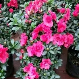 石楠杜鹃为多年生常绿灌木或小乔木,植株多分枝,树冠丰满,株型紧凑;叶片互生,密集着生于枝条顶端,叶片椭圆状或披针形,革质有光泽,某些品种叶面上还有金黄色斑纹或镶边;叶背颜色稍浅,密被茸毛。石楠杜鹃的花序为总状伞形,花顶生,常数朵聚生于枝头,盛开时呈球状,其直径通常在15厘米~20厘米,个别品种可达25厘米以上;花朵钟状,单瓣或重瓣;花色丰富,有紫红、红、粉红、橙红、桃红、紫蓝、白、黄等多种颜色。其自然花期为3月~5月,经人工催花可提前到1月~2月开放,单株花期可达一个月。