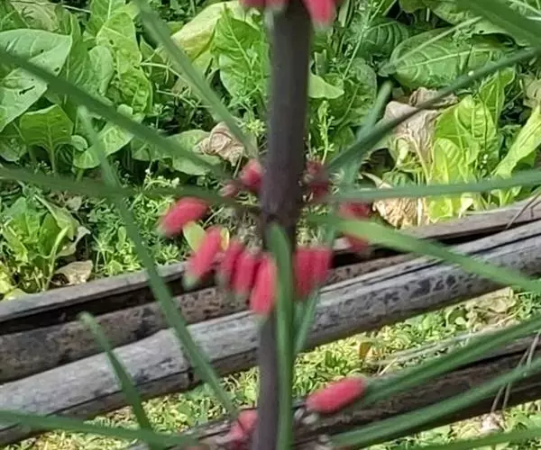 滇黄精(Polygonatum kingianum Coll. et Hemsl)百合科黄精属草本植物,根状茎近圆柱形或近连珠状,结节有时作不规则菱状,肥厚。茎顶端作攀援状。叶轮生,每轮3-10枚,条形、条状披针形或披针形,先端拳卷。花序具花,总花梗下垂,花梗苞片膜质,微小,通常位于花梗下部;花被粉红色,裂片长3-5毫米;花丝长3-5毫米,丝状或两侧扁,花药长4-6毫米;子房长4-6毫米。浆果红色,直径1-1.5厘米,具7-12颗种子。花期3-5月,果期9-10月。