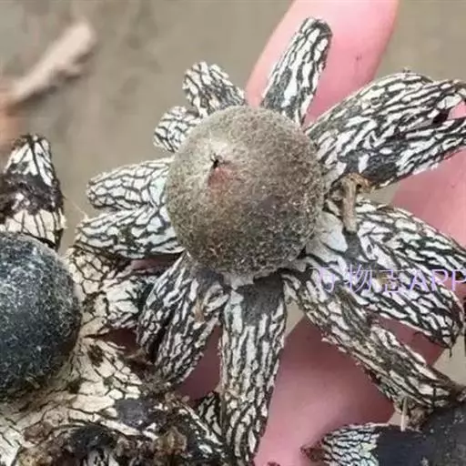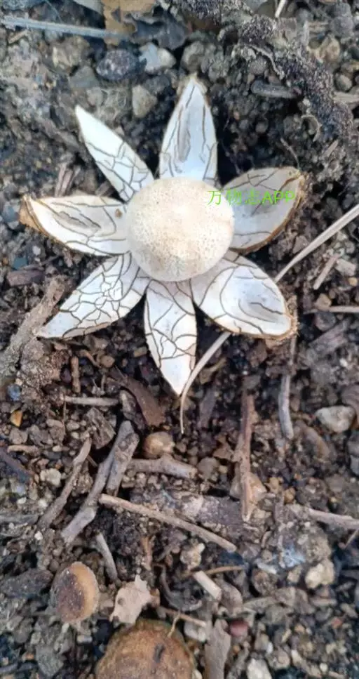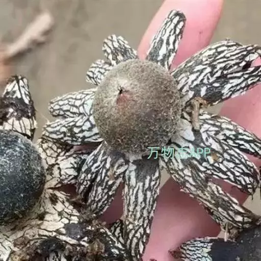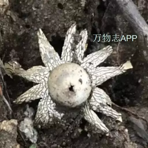 2、尖顶地星:又名土星菌、米屎疏。包被呈圆球形,顶部具一尖喙。包被径3-8cm,外包被呈芒状开裂5-8瓣,背面灰色,腹面肉桂色,有龟裂。内包被灰色,薄膜状,直径1.7-2.7cm。成熟时顶端开裂。孢体锈褐色,基部有短柄状的轴托。孢子球形,褐色,有疣突,3.5-5.5μm。孢丝线状,淡褐色,径5-6μm。