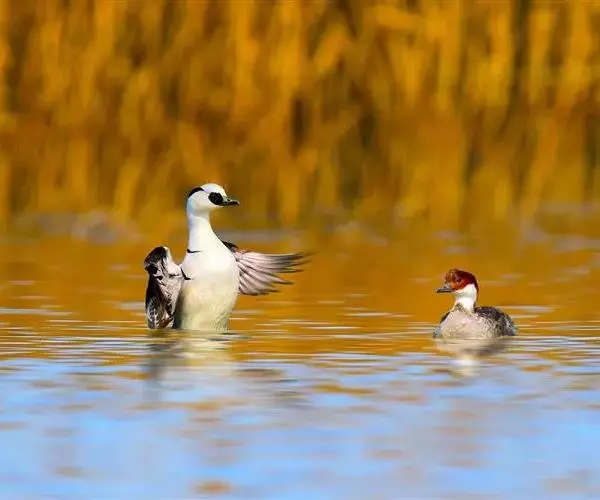 斑头秋沙鸭(学名:Mergellus albellus)是鸭科、斑头秋沙鸭属的水鸭。 全长约420毫米。雄鸟体羽以黑白色为主。眼周、枕部、背黑色,腰和尾灰色。两翅灰黑色。雌鸟上体黑褐色,下体白色。头顶栗色。栖息于湖泊、河流和池塘等地带,善游泳和潜水。以鱼类、无脊椎动物和少量植物性食物为食。繁殖期5-7月,巢营于绝壁上,也有的在洞穴中,每窝产卵6-10枚。栖息在湖泊、江河、水塘、水库、河口、海湾和沿海褐泽地带。食物主要为小鱼,也大量捕食软体动物、甲壳类、石蚕等水生无脊椎动物,偶尔也吃少量植物性食物。分布于欧洲和俄罗斯北部,往东到西伯利亚东部,直到太平洋沿岸,往南到伏尔加河下游,土耳其和黑龙江一带。