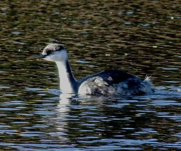 雄鸟繁殖羽头颈白色,眼周和眼先黑色,在眼区形成一黑斑。枕部两侧黑色,中央白色,各羽均延长形成羽冠。背黑色,上背前部白色而具黑色端斑,形成两条半圆形黑色狭带,往下到胸侧。初级飞羽和初级覆羽黑褐色,外侧次级飞羽黑色而具白色端斑,其次2、3枚内侧次级飞羽外侧白色或银灰色,其余次级飞羽乌灰色。大覆羽黑色,具白色端斑。小覆羽也为黑色,中覆羽白色,在翅上形成一个大而明显的白色翼斑。肩前部白色,后部暗褐色;腰和尾上覆羽灰褐色,尾羽银灰色。下体白色,两胁、具灰褐色波浪状细纹。雄鸟非繁殖羽似雌鸟,但眼先黑色部分较窄,且不甚明显。