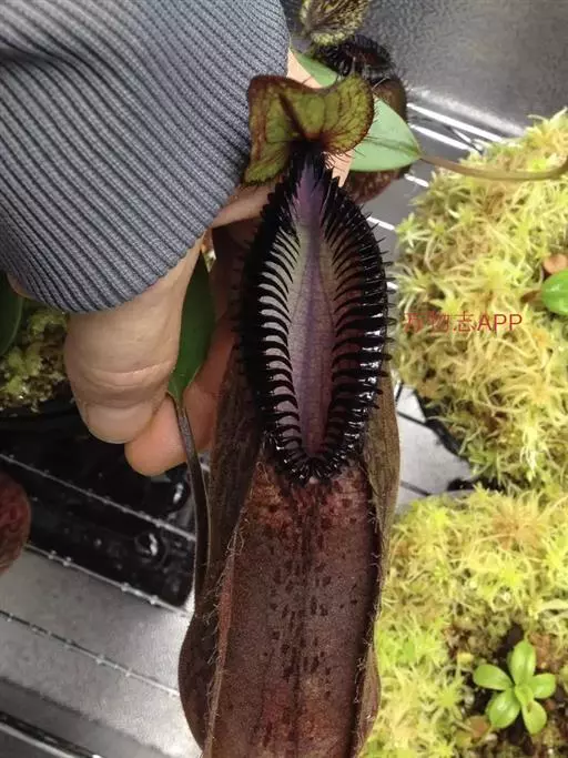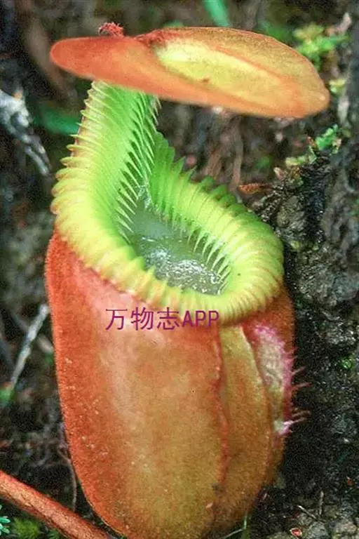 钩唇猪笼草为苏拉威西特有的热带食虫植物,其生长于海拔1400至2500米处。其种加词“hamata…