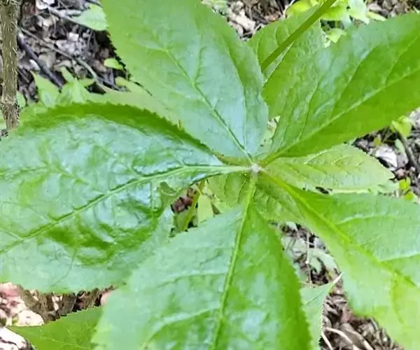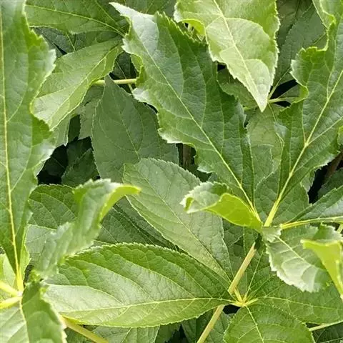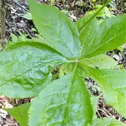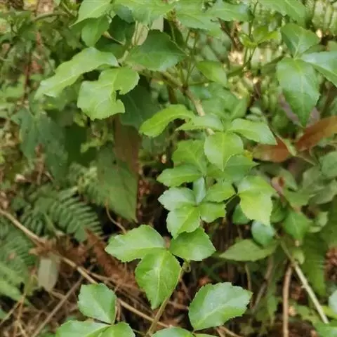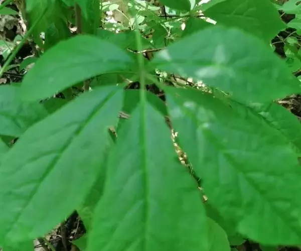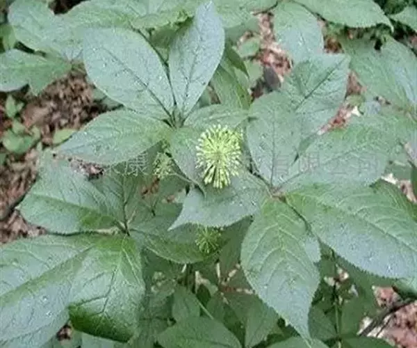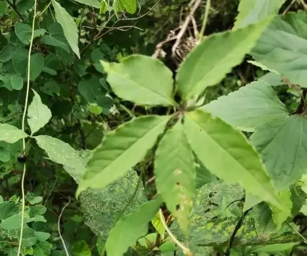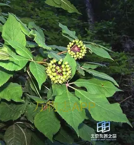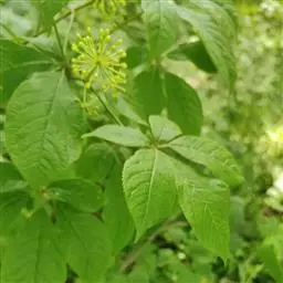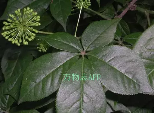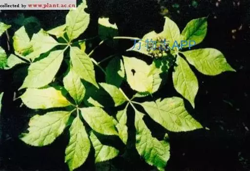 刺五加(拉丁学名:Acanthopanax senticosus (Rupr. Maxim.) Harms),别名:坎拐棒子、老虎潦、一百针。灌木,高1-6米;分枝多。叶有小叶5,稀3;叶柄常疏生细刺,小叶片纸质,椭圆状倒卵形或长圆形,先端渐尖,基部阔楔形,上面粗糙,深绿色,脉上有粗毛,下面淡绿色,脉上有短柔毛,边缘有锐利重锯齿;小叶柄有棕色短柔毛。伞形花序单个顶生,有花多数;总花梗无毛,花梗无毛或基部略有毛;花紫黄色;萼无毛;花瓣卵形;子房5室,花柱全部合生成柱状。果实球形或卵球形。花期6-7月,果期8-10月。