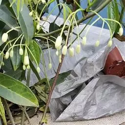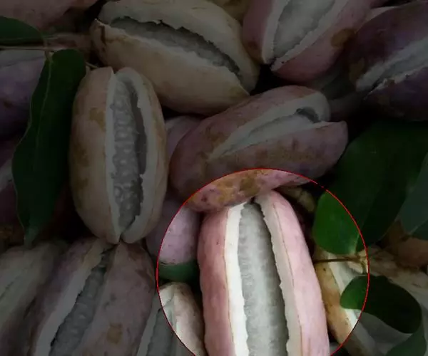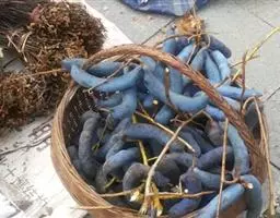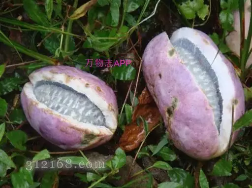 花数朵组成伞房花序式的总状花序;总花梗纤细,长1-3.5(5)厘米,数枚簇生于叶腋,基部覆以阔卵形至近圆形的芽鳞片。雄花:绿白色,外轮萼片长圆形,长12-15毫米,宽4-5毫米,先端钝,内轮的较狭,长圆状披针形,先端急尖;花瓣极小,倒卵形,长不及1毫米;雄蕊长约12毫米,花丝线形,长约7毫米,稍粗,花药长约5毫米,顶具短凸头,退化心皮小,卵状锥形,长约1.5毫米。雌花:紫色,外轮萼片卵状长圆形,长约22毫米,宽7-8毫米,内轮的较狭和较短;退化雄蕊小,花药棒状;花瓣小;心皮长圆形或圆锥状,柱头无柄,偏斜。果为不规则的长圆形或椭圆形,熟时红紫色,长(3)5-7厘米,直径2-2.5厘米,两端钝而顶常具凸头,外面密布小疣凸;种子多数,倒卵形,种皮褐色。花期4-5月,果期7-9月。