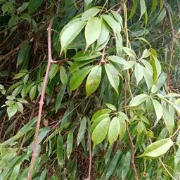 常绿木质藤本。茎与枝具明显的线纹。掌状复叶有小叶3-9片;叶柄稍纤细,长3.5-10厘米;小叶近革质,卵形、卵状长圆形、狭披针形或线状披针形,长5.5-14厘米,宽(2.5)3.5-5厘米,先端渐尖或尾状渐尖,基部圆或阔楔形,有时近截平,上面暗绿色,有光泽,下面淡绿色;侧脉每边5-6条,至近叶缘处网结,与中脉及纤细的网脉均于下面清晰凸起;小叶柄纤细,长2-4厘米,中间1枚最长。