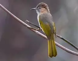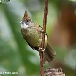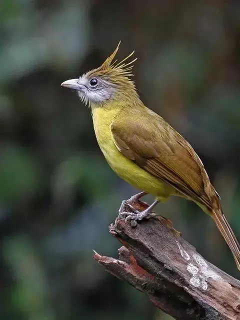 白喉冠鹎:体长20-25厘米。头顶红褐色,有长而细的羽冠、红褐色,头侧灰色。上体橄榄绿黄色,…