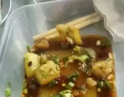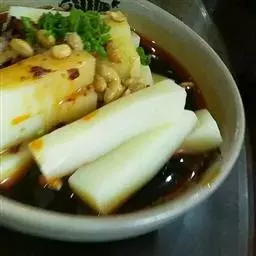 1、将调味料1用果汁机打成泥状(可加入少许色拉油)。油豆腐切片备用。