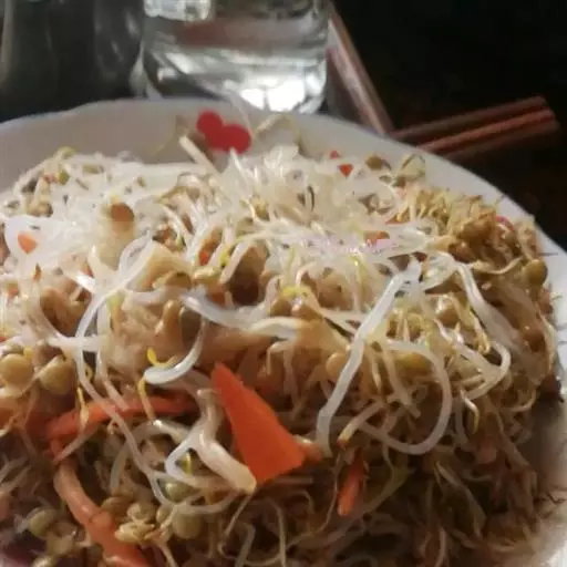 3、将豆芽菜烫至熟,放入碗中,将1/4个水煮蛋放入,最后撒上红葱头酥、九层塔及辣椒片即完成。