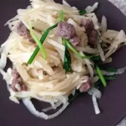 4.锅加热下油先煸炒肉丝断生盛出。