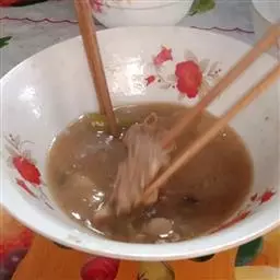 材料: 草虾3尾,油豆腐2个,鱼丸20克,豆芽菜20克,水煮蛋1/4个,米粉100克,红葱头酥少许,九层塔叶2片,辣椒片3片