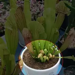 全株无毛,株高在原产地为20厘米,但栽培中相当低矮。从基部丛生很多分枝,茎和分枝初白色肉质状,后变褐色,下部中空。叶无柄,交互对生,长1厘米,宽和厚均为0.6厘米,正面平背面浑圆似半球状,肉质坚硬。黄绿色叶缘呈红色。花白一柠檬黄色。