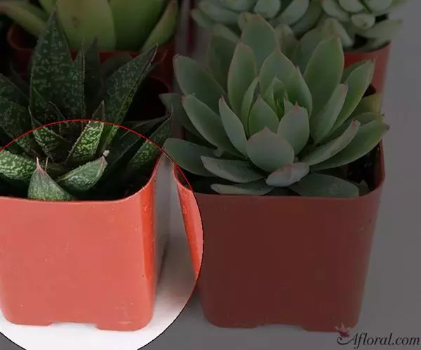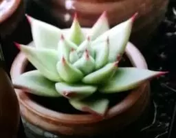 叶片光洁,底色灰绿,均匀密布深红斑纹,背部龙骨线凸起、呈棕色,三角卵形,先端尖锐,长3-4厘米。莲座直径8-12厘米。花长10-12毫米,亮红色。