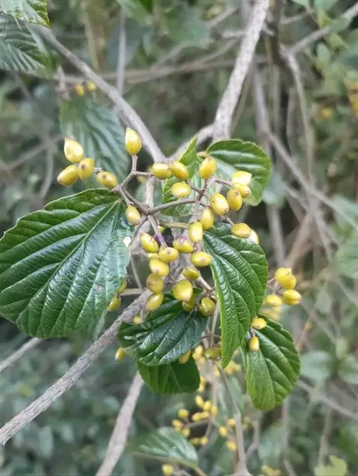 南方荚蒾,别名火柴树、荚蒾、满山红、苍伴木《广西本草选编》,火斋《全国中草药汇编》,酸汤泡《湖南药物志》,苦茶子、人丹子、赤籽、晒谷子《福建药物志》,土五味《贵州中草药名录》。灌木或小乔木,高3-5m。幼枝、芽、叶柄、花序、萼和花冠外面均被由暗黄色或黄褐色的簇状毛。叶对生;叶柄长5-12mm;叶膜状坚纸质至膜状,叶片宽卵形或菱状卵形,长4-7cm,宽2.5-5cm,先端尖至渐尖,基部钝或圆形,边缘基部以上疏生浅波状小尖齿,上面绿色,有时沿脉散生有柄的红褐色小腺点,下面淡绿色,沿各级脉上具簇状绒毛,侧脉每边5-7条,伸达齿端,与中脉在叶上面凹陷,在下面突起。复伞形式聚伞花序顶生或生于具1对叶的侧生小枝之顶,直径3-8cm;总梗长1-3.5cm,第1级辐射枝5条;花着生于第3-4级辐射枝上;花萼外被簇状毛,萼筒长约1mm,萼齿5,三角形,长约0.3mm;花冠白色,辐状,直径4-5mm,裂片卵形,长约1.5mm;雄蕊5,近等长或超出花冠。核果卵状球形,长6-7mm,红色;核扁,长约6mm,直径约4mm,有2条腹沟和1条背沟。花期4-5月,果期10-11月。