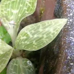 大花斑叶兰植株高5-15厘米。根状茎伸长,茎状,匍匐,具节。茎直立,绿色,具4-5枚叶。叶片卵形或椭圆形,长2-4厘米,宽1-2.5厘米,上面绿色,具白色均匀细脉连接成的网状脉纹,背面淡绿色,有时带紫红色,具柄;叶柄长1-2.5厘米,基部扩大成抱茎的鞘。