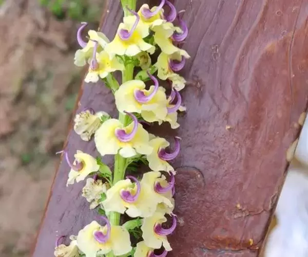 总状花序顶生,伸长,长可达1 s厘米,多花,顶端稠密,下中部疏稀或有间隔;苞片叶状,具短柄,下部的比萼长,上部的短于萼,裂片数目亦渐减少;花具短梗,长约1-2.5毫米,纤细,被短柔毛;萼卵状圆筒形,长约6-7毫米,管膜质,前方开裂至管的中部。3条主脉与次脉约7-8条,不很凸起,仅靠近萼齿处略有网纹。萼齿3枚,草质,长约为萼管的1/2-1/3,不等,后方的一枚较小,线形,全缘或上部扩大。倒披针形,有少数之齿,其余的两枚宽卵形,基部细缩,全缘,上部不整齐,掌状分裂,裂片有重锯齿;花冠具黄色的花管及下唇,紫色或紫紫色的盔,长约16-20毫米,花管伸直,约比萼长1倍,外被短毛,盔不但在直立部分顶端几以直角向前转折,并在这一部分与合有雄蕊部分两者之M的一段中作一半周的向右扭旋,恰好使后者之顶转向前方,而S形的长喙则又因其在自身的轴上扭转而先向上,再向后,最后再转指向上方,喙顶端微缺,沿其近基的2/3的缝线上有透明的狭鸡冠状凸起1条,下唇大,宽过于长,长约10毫米,宽约13毫米。以直角开展,3裂,被长椽毛,中裂较小,稍凸出,倒卵形,顶端截头或微凹,基部狭缩成柄,不迭置于侧裂之下,侧裂肾脏形,宽过于长,宽约9毫米,长约5毫米,雄蕊着生花管顶部。2对花丝均被毛;子房狭卵圆形,长约2.5毫米,柱头伸出于盔外。