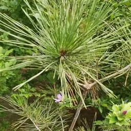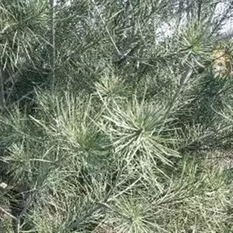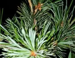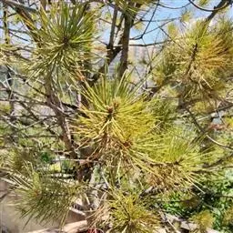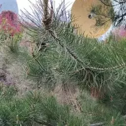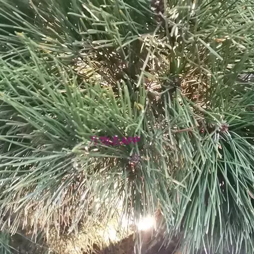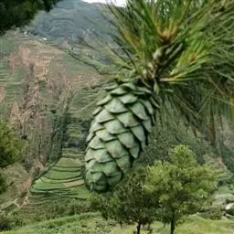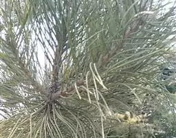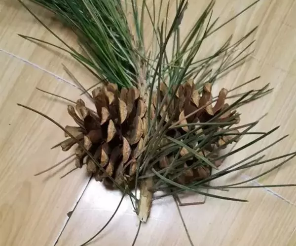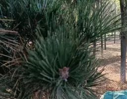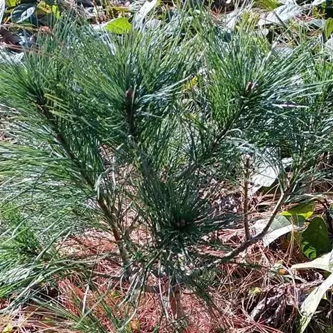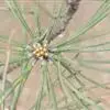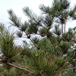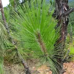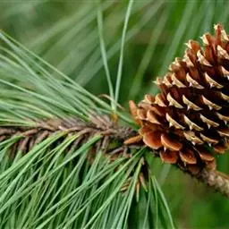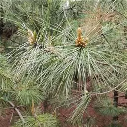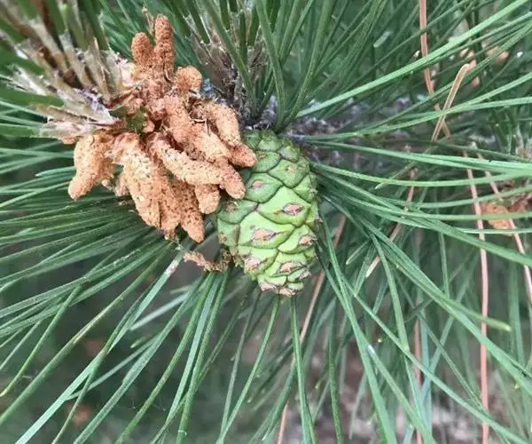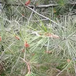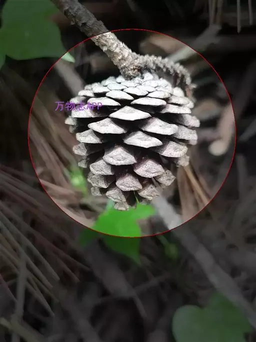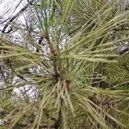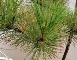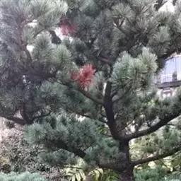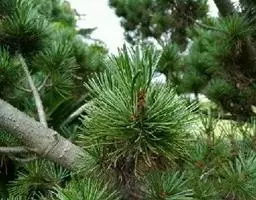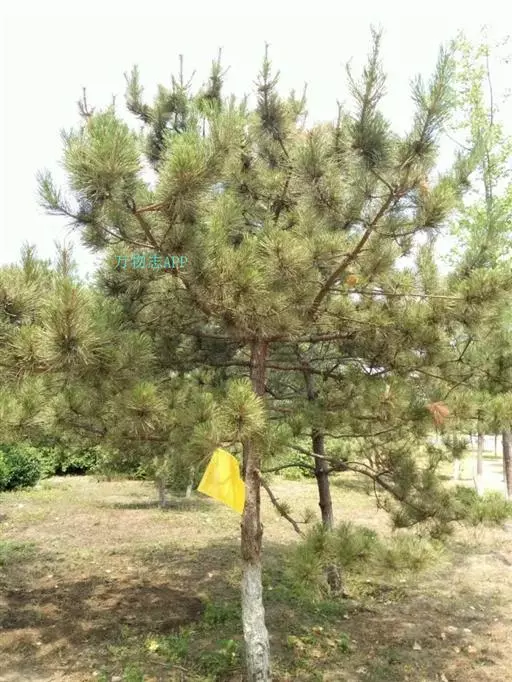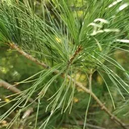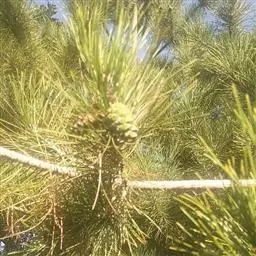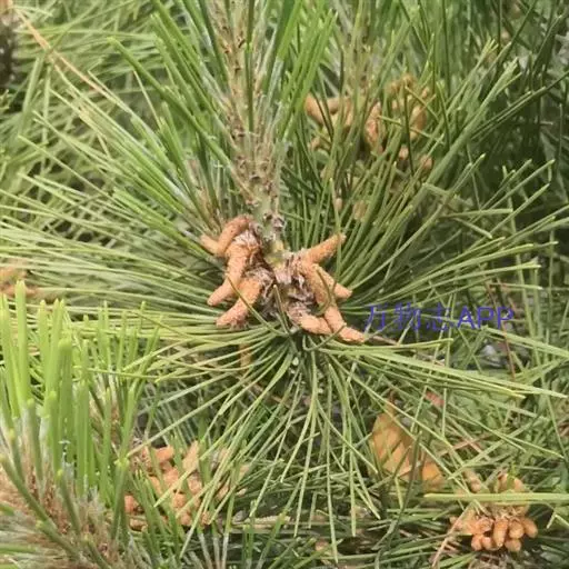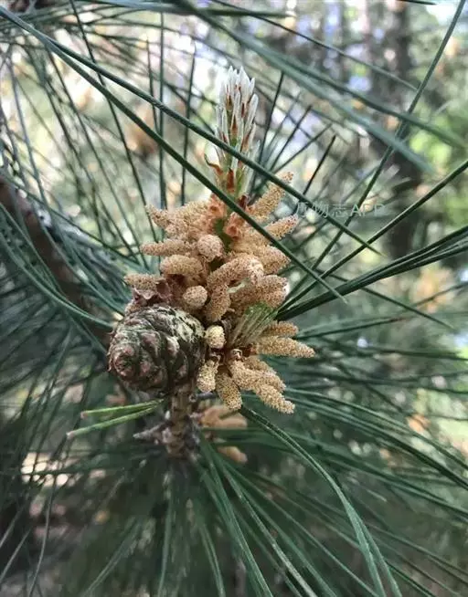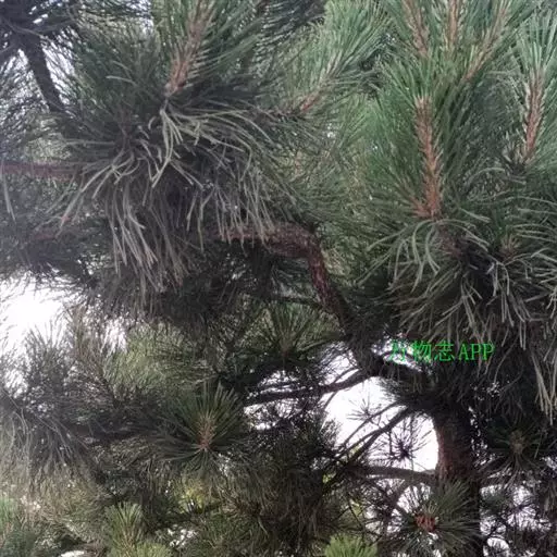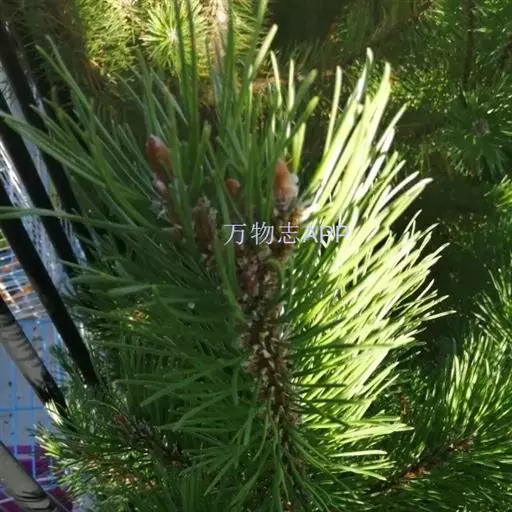 松树叶 针叶2针一束,稀3针一束,长12-20厘米,细柔,微扭曲,两面有气孔线,边缘有细锯齿;横切面皮下层细胞单型,第一层连续排列,第二层由个别细胞断续排列而成,树脂道约4-8个,在背面边生,或腹面也有2个边生;叶鞘初呈褐色,后渐变成灰黑色,宿存。雄球花淡红褐色,圆柱形,弯垂,长1-1.5厘米,聚生于新枝下部苞腋,穗状,长6-15厘米;雌球花单生或2-4个聚生于新枝近顶端,淡紫红色,一年生小球果圆球形或卵圆形,径约2厘米,褐色或紫褐色,上部珠鳞的鳞脐具向上直立的短刺,下部珠鳞的鳞脐平钝无刺。球果卵圆形或圆锥状卵圆形,长4-7厘米,径2.5-4厘米,有短梗,下垂,成熟前绿色,熟时栗褐色,陆续脱落;中部种鳞近矩圆状倒卵形,或近长方形,长约3厘米;鳞盾菱形,微隆起或平,横脊微明显,鳞脐微凹,无刺,生于干燥环境者常具极短的刺;种子长卵圆形,长4-6毫米,连翅长2-2.7厘米;子叶5-8枚;长1.2-2.4厘米;初生叶条形,长2.5-3.6厘米,叶缘具疏生刺毛状锯齿。