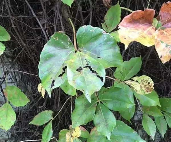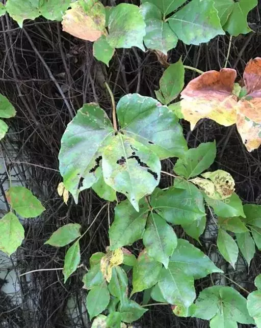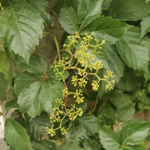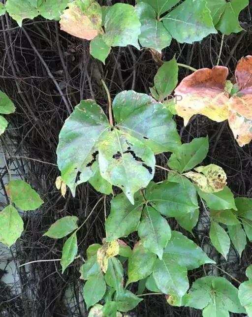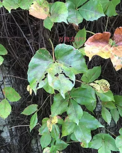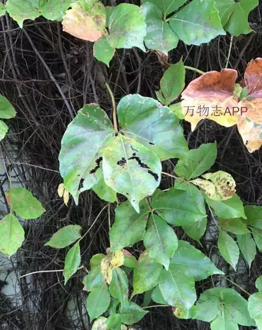 红三叶爬山虎(P.var.rubrifolia),小叶较小较阔,幼时带紫色。聚伞花序较小。