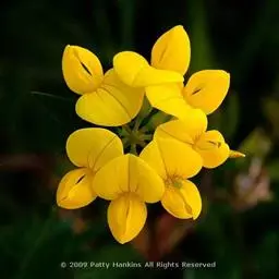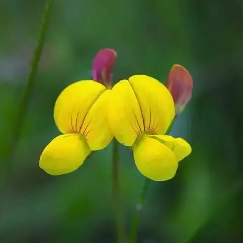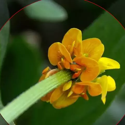 花序头状伞形,具花(1)2-10朵;总花梗腋生,纤细无毛,长3-15毫米,通常比叶短,花序轴先端不呈芒状尖;苞片甚小,尾尖;花长3-4毫米;花梗不到1毫米;萼钟形,长约2毫米,萼齿披针形,与萼筒近等长,无毛或稀被毛;花冠黄色,旗瓣倒卵形,先端凹缺,基部阔楔形,比冀瓣和龙骨瓣长,翼瓣长圆形,基部具耳和稍阔的瓣柄,齿突甚发达,龙骨瓣比翼瓣稍短,基部具小耳,成钩状;子房长圆形,镰状上弯,微被毛。