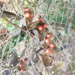 荚果盘形,暗绿褐色,顺时针方向紧旋1.5-2.5(-6)圈,直径(不包括刺长)4-6(-10)毫米,螺面平坦无毛,有多条辐射状脉纹,近边缘处环结,每圈具棘刺或瘤突15枚;种子每圈1-2粒。种子长肾形,长约2.5毫米,宽1.25毫米,棕褐色,平滑。花期3-5月,果期5-6月。