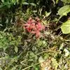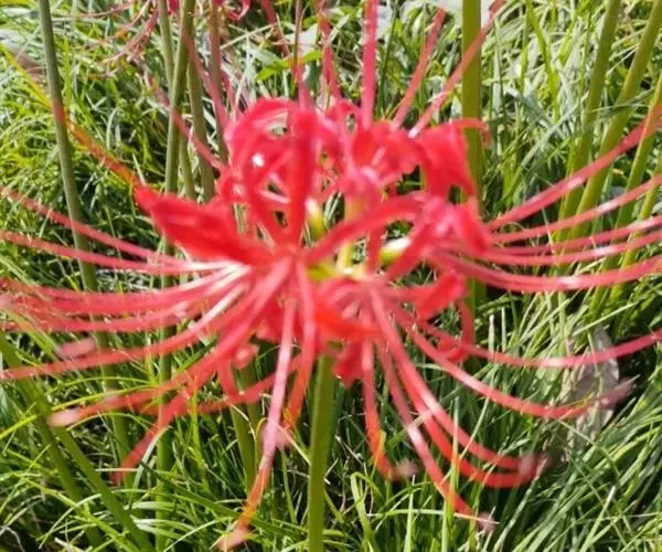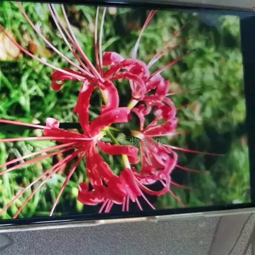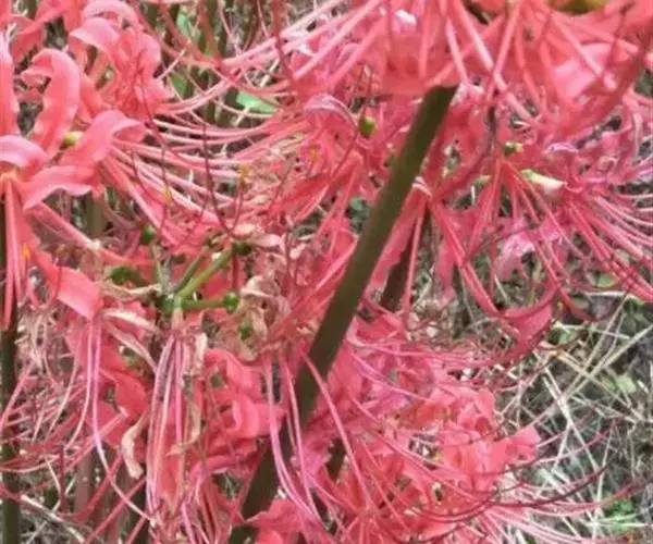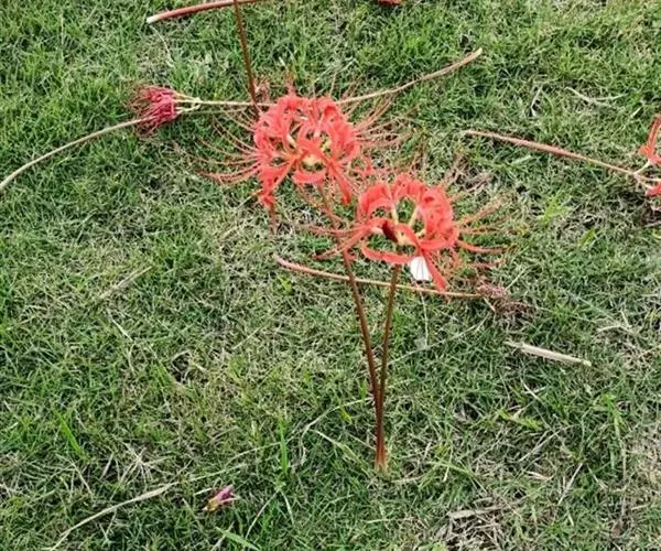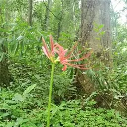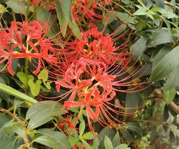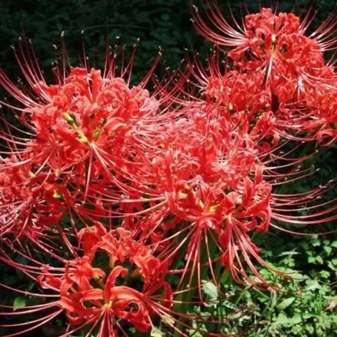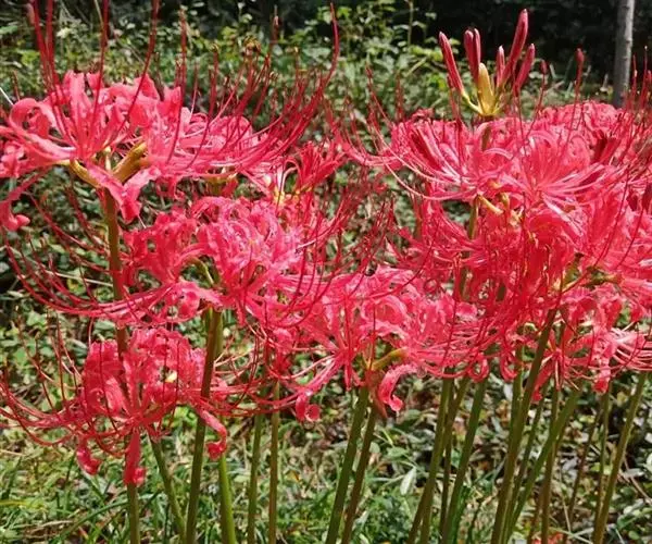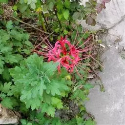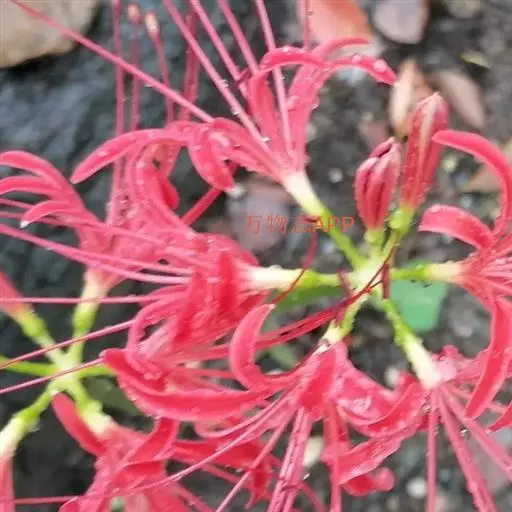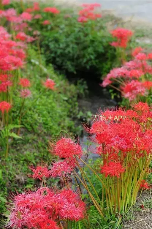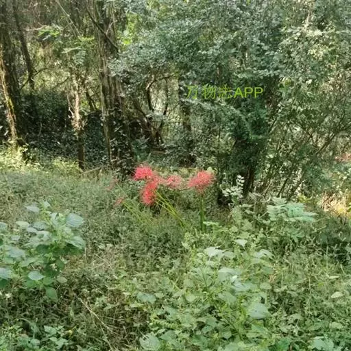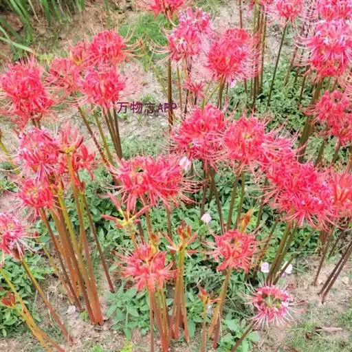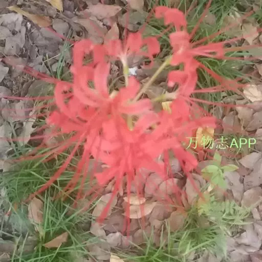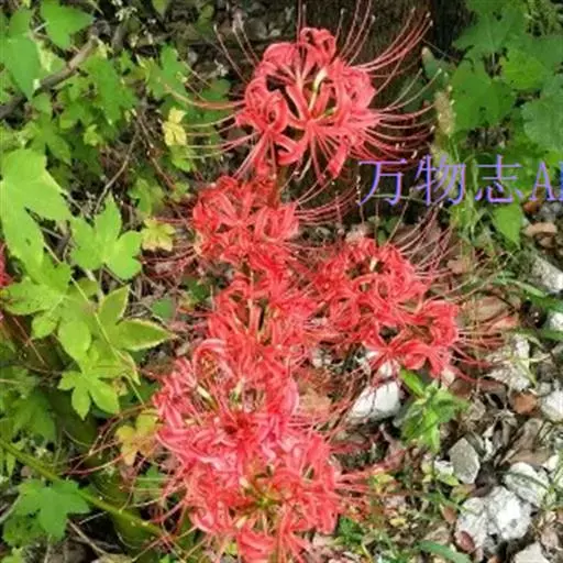 石蒜(学名:Lycoris radiata (L’Her.) Herb.):鳞茎近球形。秋季出叶,叶狭带状,顶端钝,深绿色,中间有粉绿色带;花茎高约30厘米;总苞片2枚,披针形;长约35厘米,宽约05厘米;伞形花序有花4-7朵;花鲜红色;花被裂片狭倒披针形,长约3厘米,宽约05厘米,强度皱缩和反卷;花被简绿色,长约05厘米;雄蕊显著伸出于花被外,比花被长1倍左右。花期8-9月,果期10月。