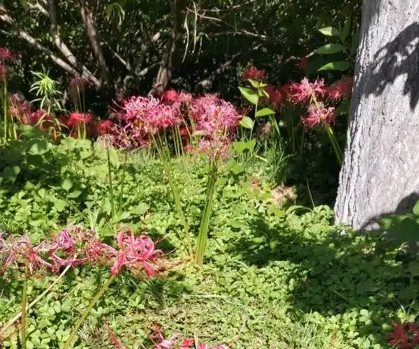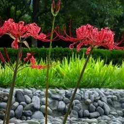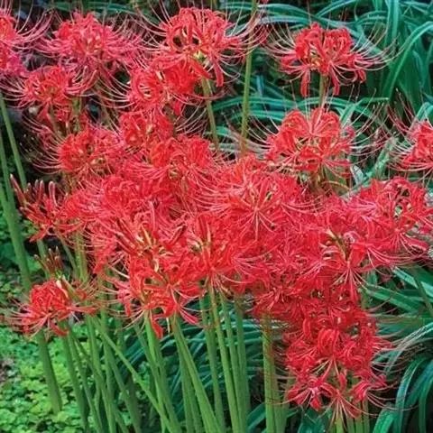 石蒜是东亚常见的园林观赏植物,冬赏其叶,秋赏其花。是优良宿根草本花卉,园林中常用作背阴处绿化或林下地被花卉,花境丛植或山石间自然式栽植。因其开花时光叶,所以应与其他较耐明的草本植物搭配为好。可作花坛或花径材料,亦是美丽的切花。