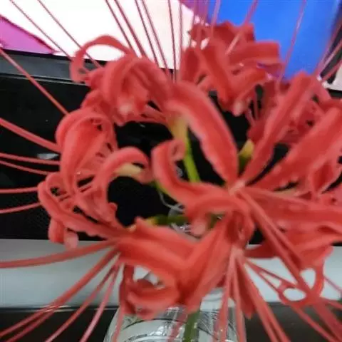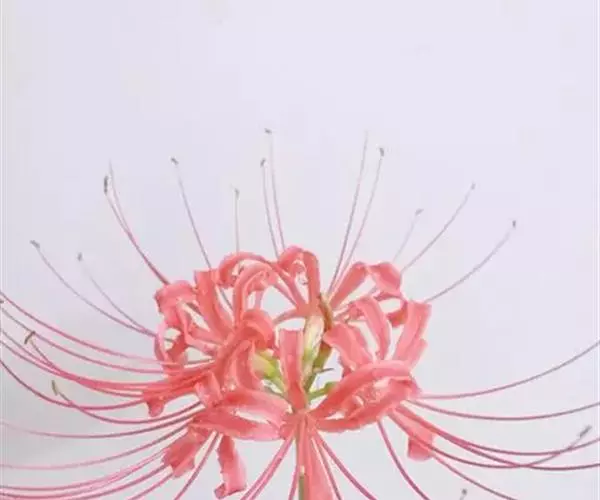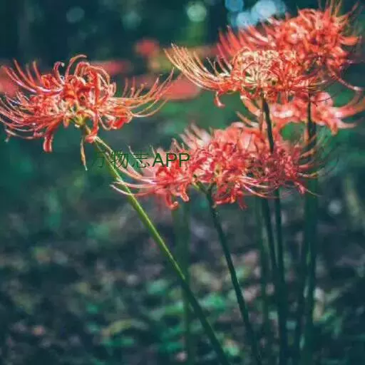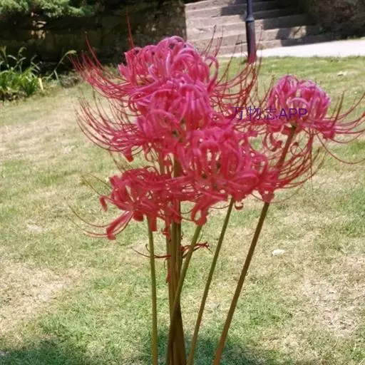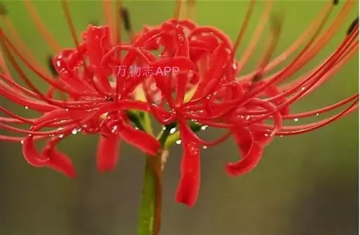 石蒜是多年生草本植物,鳞茎近球形,直径1-3厘米。秋季出叶,叶狭带状,长约15厘米,宽约0.5厘米,顶端钝,深绿色,中间有粉绿色带。花茎高约30厘米;总苞片2枚,披针形,长约35厘米,宽约05厘米;伞形花序有花4-7朵,花鲜红色;花被裂片狭倒披针形,长约3厘米,宽约05厘米,强度皱缩和反卷,花被简绿色,长约05厘米;雄蕊显著伸出于花被外,比花被长1倍左右。花期8-9月,果期10月。
