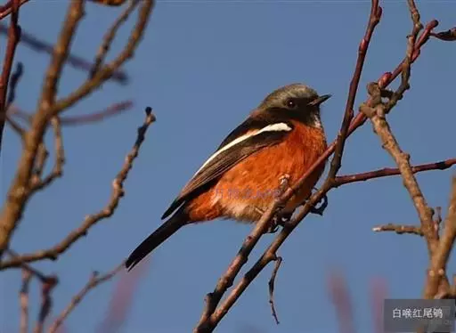 白喉红尾鸲(学名:Phoenicurus schisticeps),小型鸟类,体长14-16厘米。雄鸟额至枕钴蓝色,头侧、背、两翅和尾黑色,翅上有一大形白斑,腰和尾上覆羽栗棕色。颏、喉黑色,下喉中央有一白斑,在四周黑色衬托下极为醒目,其余下体栗棕色,腹部中央灰白色。雌鸟上体橄榄褐沾棕,腰和尾上覆羽栗棕色,翅暗褐色具白斑,尾棕褐色。下体褐灰色沾棕,喉亦具白斑。特征均甚明显,野外不难识别。