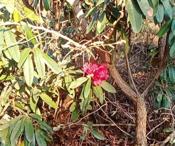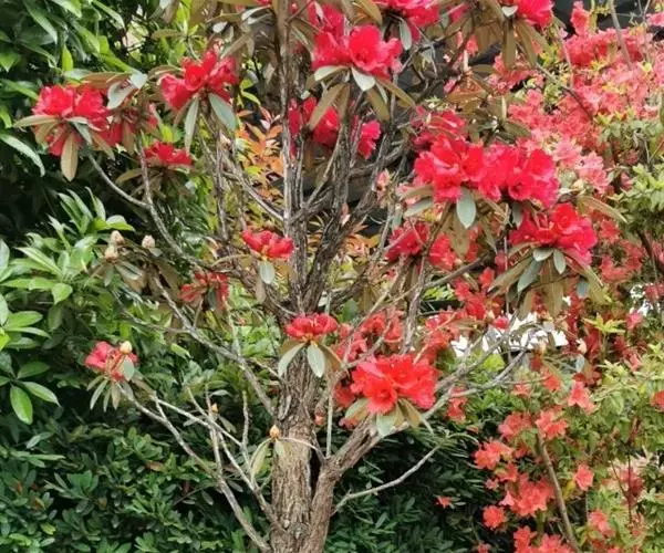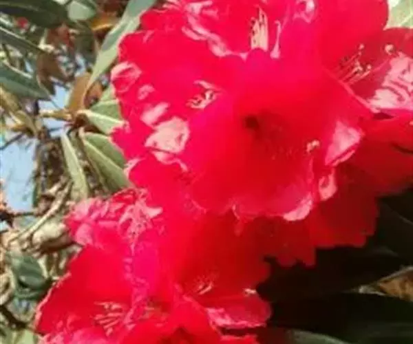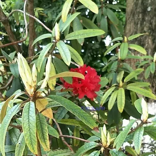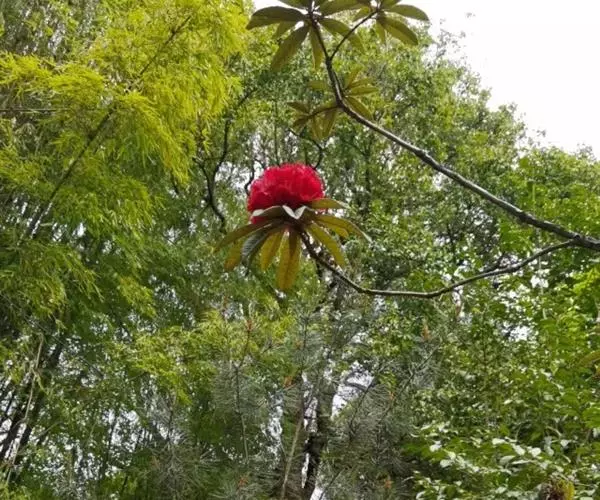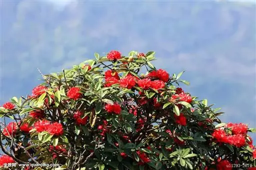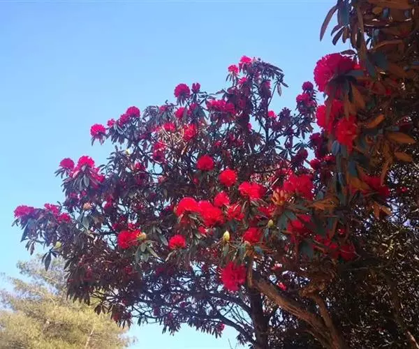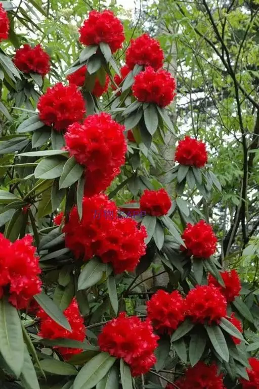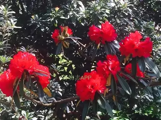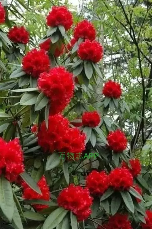 马缨杜鹃(学名:Rhododendron delavayi Franch.):常绿灌木或小乔木,高1-7米;树皮淡灰褐色;幼枝粗壮。顶生冬芽卵圆形,淡绿色。叶革质,长圆状披针形,上面深绿至淡绿色,下面有白色至灰色或淡褐色。顶生伞形花序,圆形,紧密,有花10-20朵;花冠钟形,长3-5厘米,直径3-4厘米,肉质,深红色,裂片5,近于圆形。蒴长圆柱形,黑褐色。花期5月,果期12月。