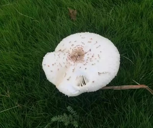 子实体中等至稍大。菌盖直径3-15厘米不等,初半球形,后 大孢花褶伞 近平展,有时中部下凹,白色或乳白色,光滑或后期具丛毛状鳞片,开燥时边缘开裂。菌肉白色,厚。菌褶粉红色呈褐色,黑色,较密,离生,不等长。菌柄粗短,圆柱形,稍弯曲,1-9×0.5-2厘米,近光滑或略有纤毛,白色,内实。菌环单层,白色,膜质,生于菌柄中部,易脱落。担子上有两个担孢子,所以称为双孢蘑菇,孢子印深褐色。孢子褐色,椭圆形,光滑,6.5-10×5-6.5微米。