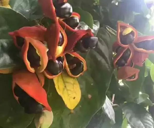 萍婆(Sterculia nobilis),属梧桐科的一种植物。又称“凤眼果”。常绿乔木。叶长椭圆形;初夏开花,无花冠,花萼粉红色,圆锥花序;果实分为四五个分果,外面暗红色,内面漆黑色。黑褐色椭圆球形种子。
