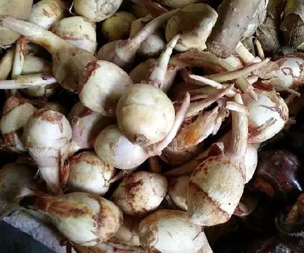 采收时间因地区不同而异。山东一带自秋季初霜后(茎叶枯黄时)到第2年球茎发芽前,即11月至翌年3月,可随时采收,在霜降到大雪期间采收较多,在地上部茎叶刚枯黄时采收产量较低,一般延迟采收产量高。这是因为茎叶刚枯黄时,短缩茎中的养分仍可继续向球茎输送,使球茎继续膨大,从而增加产量。所以,在10月底到11月初排去田水,并割去慈姑叶片,留茬15厘米左右。割叶后每隔2m开沟,沟深30厘米左右,畦面晒干并整细,套种越冬青菜,既可增加慈姑产量,又可在1-2月蔬菜淡季供应上市,提高经济效益。
