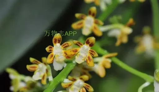 花序出自叶腋,比叶长,多分枝;花序柄粗壮,圆锥花序疏生许多花;花苞片小,卵状披针形,长1-2毫米,先端渐尖;花梗和子房长4毫米;萼片和花瓣黄色带褐红色斑点;中萼片近长圆形,凹下呈舟状,长约3.5毫米,宽2.5毫米,先端钝;侧萼片稍斜长圆形,与中萼片近等大,先端圆形,基部贴生于蕊柱足。