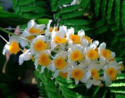 大叶隔距兰(学名:Cleisostoma racemiferum (Lindl. ) Garay):茎直立,粗壮,长5-20厘米,连同叶鞘粗2-2.5厘米,具分枝、长而粗壮的根。叶厚革质,扁平、带状,长达29厘米,宽3-4厘米,基部具1个关节和抱茎的叶鞘。花序出自叶腋,比叶长,多分枝;花序柄粗壮,圆锥花序疏生许多花;花瓣长圆形,长3毫米,宽2毫米,先端钝;唇瓣白色,3裂;药帽前端收狭为喙状。花期6月。