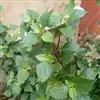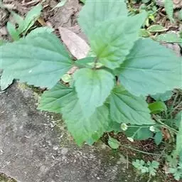 基部叶卵状披针形,花期枯萎;中部叶卵圆形或卵形,开展,长3.5-12厘米,宽1.8-6厘米,基部宽楔形,下延成具翼而长1-3厘米的柄,先端渐尖,边缘有尖头状规则或不规则的粗齿;上部叶渐小,披针形或卵状披针形;全部叶上面深绿色,下面淡绿色,基出三脉,侧脉和网脉明显,两面被平伏短柔毛,沿脉有长柔毛。
