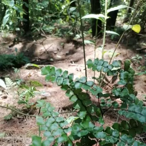 团羽铁线蕨 陆生中小形蕨类,体形变异很大。根状茎或短而直立或细长横走,具管状中柱, 植株高8-15厘米。根状茎短而直立,被褐色披针形鳞片。叶簇生;柄长2-6厘米,粗约0.5厘米,纤细如铁丝,深栗色,有光泽,基部被同样的鳞片,向上光滑;叶片披针形,长8-15厘米,宽2.5-3.5厘米,奇数一回羽状;羽片4-8对,下部的对生,上部的近对生,斜向上,具明显的柄,(长约3厘米),柄端具关节,羽片干后易从柄端脱落而柄宿存,两对羽片相距1.5-2厘米,彼此疏离,下部数对羽片大小几相等,长11-1.6厘米,宽1.5-2厘米,团扇形或近圆形,基部对称,圆楔形或圆形,两侧全缘,上缘圆形,能育羽片具2-5个浅缺刻,不育部分具细齿牙;不育羽片上缘具细齿牙;上部羽片、顶生羽片均与下部羽片同形而略小。叶脉多回二歧分叉,直达叶边,两面均明显。叶干后膜质,草绿色,两面均无毛;羽轴及羽柄均为栗色,有光泽,叶轴先端常延伸成鞭状,能着地生根,行无性繁殖。