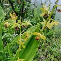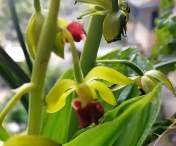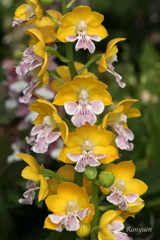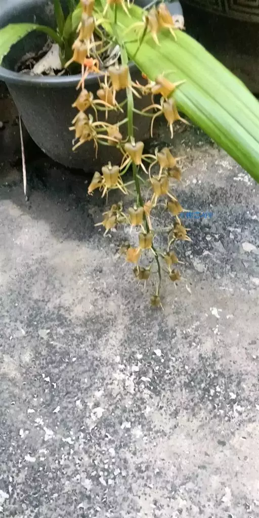 花葶从假茎上端的叶间抽出,长18-30厘米,密被短毛,总状花序长6-8厘米,疏生约10朵花;花苞片宿存,膜质,卵状披针形,长4-7毫米,先端渐尖或急尖,近无毛;花梗和子房长6-13毫米,弧曲,密被短毛,子房棒状;花瓣有多种颜色,尤其在日本,园艺品种很多,花朵极漂亮。萼片褐紫色;中萼片稍斜的椭圆形,长11-13毫米,中部宽6-7毫米,先端急尖,具5条脉,背面中部以下被短毛;侧萼片相似于中萼片。