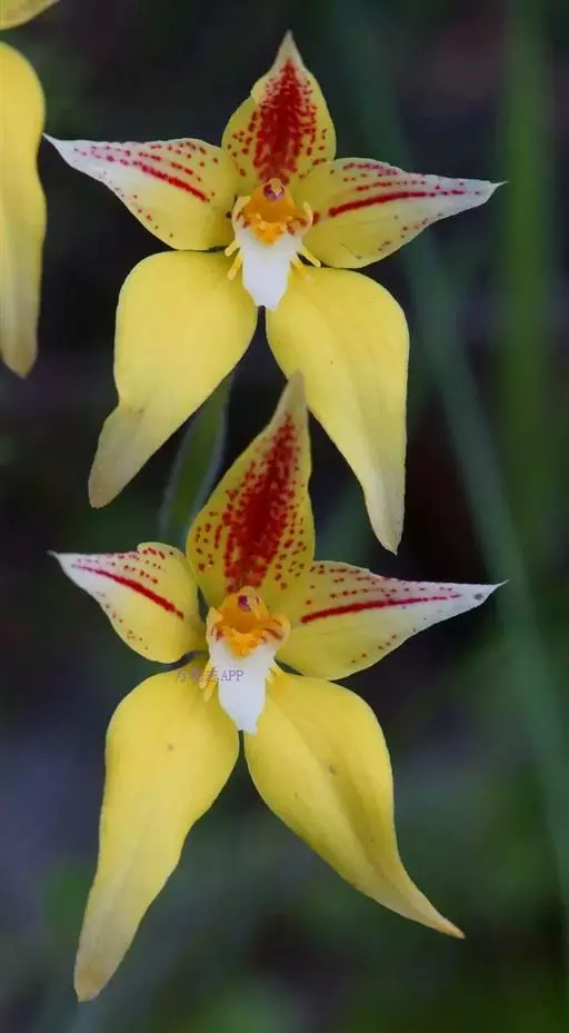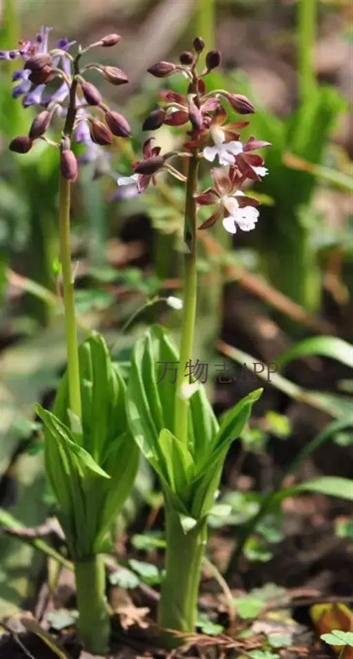 虾脊兰(学名:Calanthe discolor Lindl.):根状茎不甚明显。假鳞茎粗短,近圆锥形,粗约1厘米,具3-4枚鞘和3枚叶。叶在花期全部未展开,倒卵状长圆形至椭圆状长圆形,背面密被短毛。花葶从假茎上端的叶间抽出,密被短毛,总状花序长6-8厘米,疏生约10朵花;萼片和花瓣褐紫色;唇瓣白色,轮廓为扇形,与整个蕊柱翅合生,约等长于萼片,3深裂;。花期4-5月。