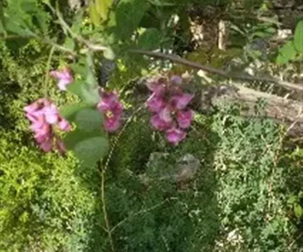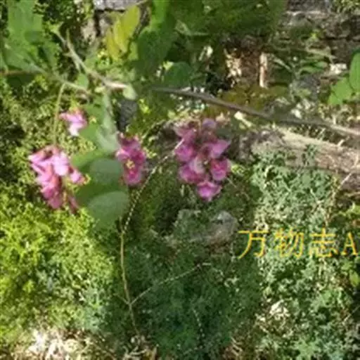 总状花序腋生,除花冠外,均被紫红色腺毛及白色细柔毛,花3-8朵;总花梗长4-8.5厘米;苞片卵状披针形,长5-6毫米,有时上部3裂,先端渐尾尖,早落;花萼紫红色,斜钟形,萼筒长约5毫米,萼齿卵状三角形,长3-6毫米,先端尾尖至钻状;花冠红色至玫瑰红色,花瓣具柄,旗瓣近肾形,长约2厘米,宽约3厘米,先端凹缺,翼瓣镰形;长约2厘米,龙骨瓣近三角形,长约1.5厘米,先端圆,前缘合生,与翼瓣均具耳;雄蕊二体,对旗瓣的1枚分离,花药椭圆形;子房近圆柱形,长约1.5厘米,密布腺状突起,沿缝线微被柔毛,柱头顶生,胚珠多数,荚果线形,长5-8厘米,宽8-12毫米,扁平,密被腺刚毛,先端急尖,果颈短,有种子3-5粒。花期5-6月,果期7-10月。