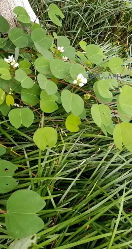 直立或攀援小灌木;小枝纤细,具棱,被微柔毛,很快变秃净。叶纸质或膜质,近圆形,通常宽度大于长度,长3-6厘米,宽4-7厘米,基部近截形、阔圆形或有时浅心形,先端2裂达中部,罅口狭,裂片先端圆钝,上面无毛,下面略被稀疏的微柔毛,多少具松脂质丁字毛;基出脉7-9(-11)条;托叶丝状早落;叶柄纤细,长6-16毫米,具沟,略被微柔毛。伞房式总状花序侧生,连总花梗长1.5-3厘米,有密集的花十余朵;总花梗短,与花梗同被短柔毛;苞片线形,锥尖,早落;花蕾椭圆形,多少被柔毛;花托陀螺形;萼佛焰状,裂片2;花瓣白色,倒披针形,连瓣柄长7-8毫米,具羽状脉;能育雄蕊通常10枚,其中5枚较长,花丝长5-6毫米,无毛;子房被茸毛,具短的子房柄,柱头盾状。荚果长圆形,扁平,长5-7.5厘米,宽9-12毫米,两端渐狭,中部两荚缝近平行,先端具短喙,成熟时开裂,果瓣革质,初时被短柔毛,渐变无毛,平滑,开裂后扭曲;种子2-4颗,卵形,略扁平,褐色,有光泽。花期5-7月;果期8-10月。 [2-3]