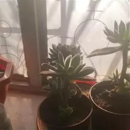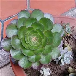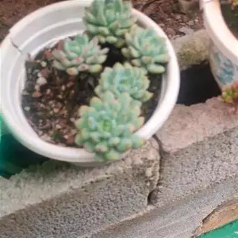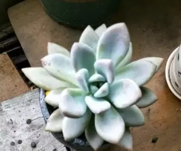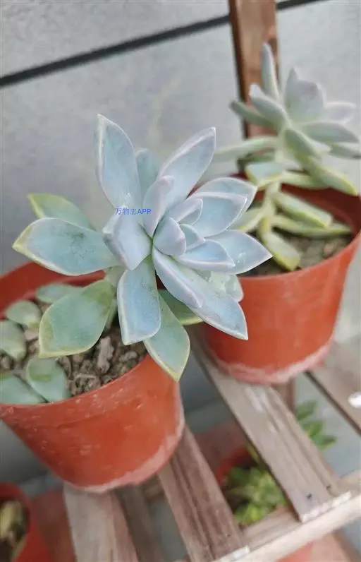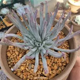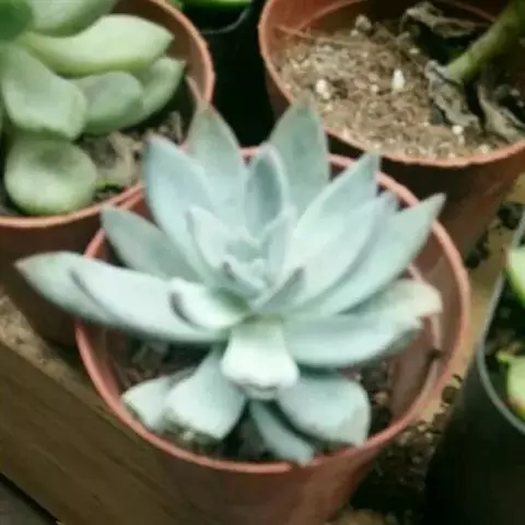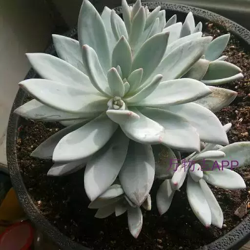 霜之朝(xPachyveria 'Powder Puff')是景天科的多肉植物,是一个源自美国的杂交品种,于1970年代被培育。由厚叶草属的鸡蛋美人(Pachyphytum oviferum)和拟石莲花属 的广寒宫(Echeveria cante)杂交而来。 喜温暖、光照充足、干燥且通风的环境,较耐旱,不耐寒、适应力较强。 叶片表面有一层天然的厚白色霜粉,使植株乍看之下呈现淡蓝色。