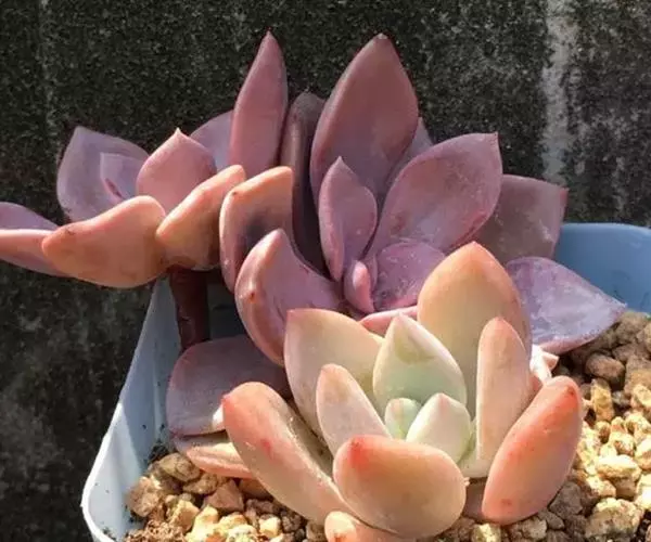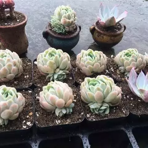 叶形叶色上佳。株型紧凑小巧,似玉片雕琢而成的莲座,多头老株颇有花团锦簇之感,多年生老株伸长的茎干可塑性成为盆景;叶片十分饱满,呈现出朦胧而梦幻的淡粉紫色,优雅中透露着几分可爱。点缀于露台或阳光充足的窗边可起到点睛作用,令人眼前一亮。
