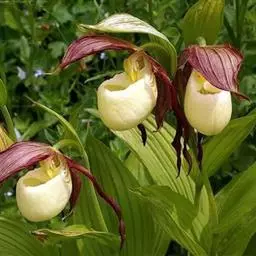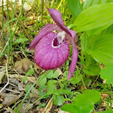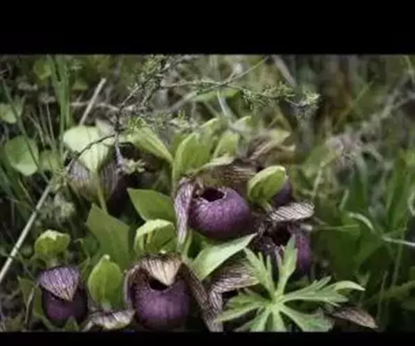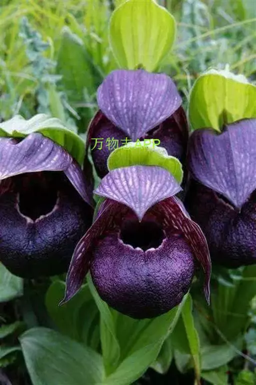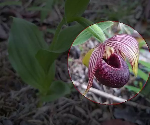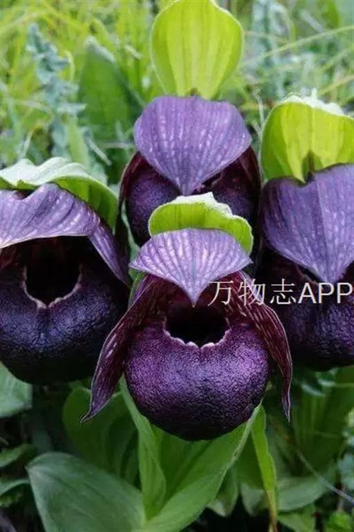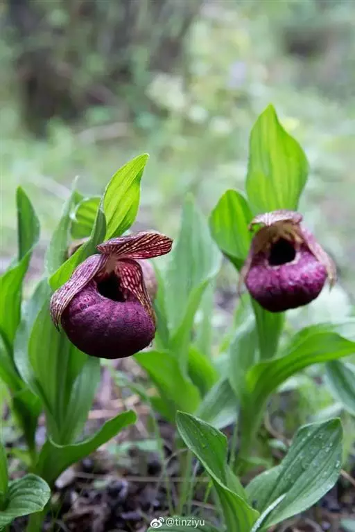 西藏杓兰(学名:Cypripedium tibeticum King ex Rolfe):植株高15-35厘米,具粗壮、较短的根状茎。茎直立,无毛或上部近节处被短柔毛,通常具3枚叶。叶片椭圆形、卵状椭圆形或宽椭圆形。花序顶生,具1花;花苞片叶状,椭圆形至卵状披针形,花大,俯垂,紫色、紫红色或暗栗色,通常有淡绿黄色的斑纹,花瓣上的纹理尤其清晰,唇瓣的囊口周围有白色或浅色的圈;中萼片椭圆形或卵状椭圆形;花瓣披针形或长圆状披针形,长3.5-6.5厘米,宽1.5-2.5厘米,先端渐尖或急尖,内表面基部密生短柔毛,边缘疏生细缘毛;唇瓣深囊状,近球形至椭圆形。花期5-8月。