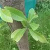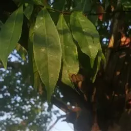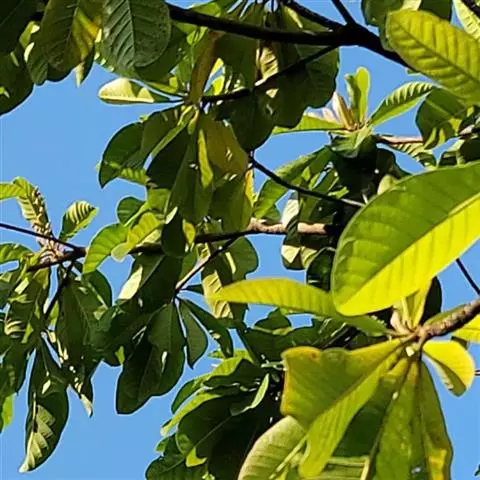 叶聚生于枝顶,革质,倒卵状披针形,长11-20厘米,宽5-7.5厘米,先端钝,偶有短小尖头,中部以下渐变狭窄,基部窄而钝,或为窄圆形,上面深绿色而发亮,干后淡绿色,下面初时有短柔毛,不久变秃净,仅在中脉上面有微毛,全缘,或上半部有小钝齿,侧脉12-14对,与网脉在上面明显,在下面突起;叶柄长1.5-3厘米,有微毛。