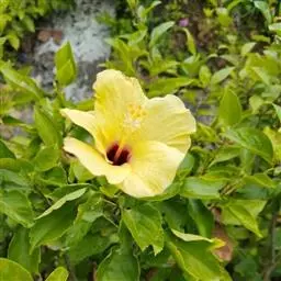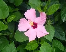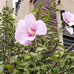 木槿(原变种):落叶灌木,高3-4米,小枝密被黄色星状绒毛。叶菱形至三角状卵形,长3-10厘米,宽2-4厘米,具深浅不同的3裂或不裂,先端钝,基部楔形,边缘具不整齐齿缺,下面沿叶脉微被毛或近无毛;叶柄长5-25毫米,上面被星状柔毛;托叶线形,长约6毫米,疏被柔毛。花单生于枝端叶腋间,花梗长4-14毫米,被星状短绒毛;小苞片6-8,线形,长6-15毫米,宽1-2毫米,密被星状疏绒毛;花萼钟形,长14-20毫米,密被星状短绒毛,裂片5,三角形;花钟形,淡紫色,直径5-6厘米,花瓣倒卵形,长3.5-4.5厘米,外面疏被纤毛和星状长柔毛;雄蕊柱长约3厘米;花柱枝无毛。蒴果卵圆形,直径约12毫米,密被黄色星状绒毛;种子肾形,背部被黄白色长柔毛。花期7-10月。