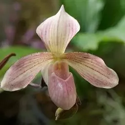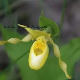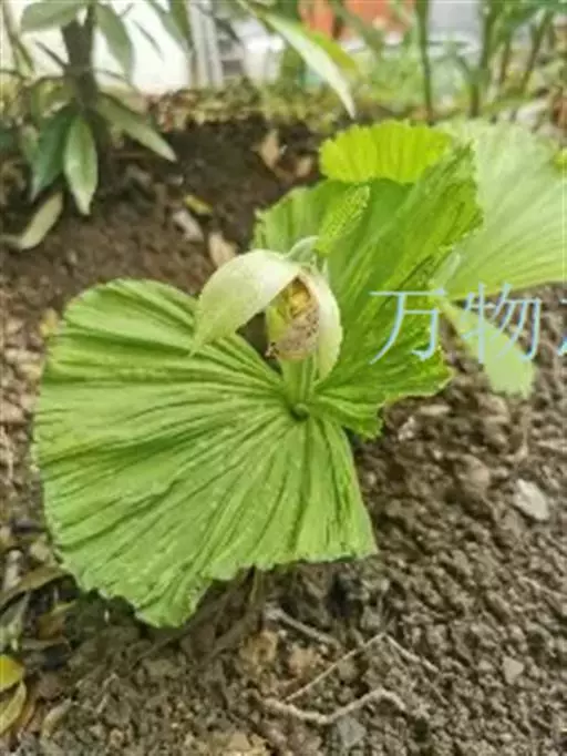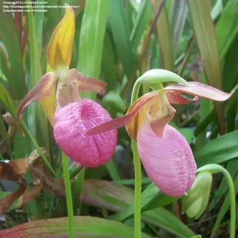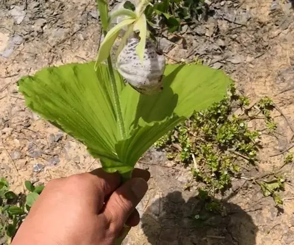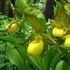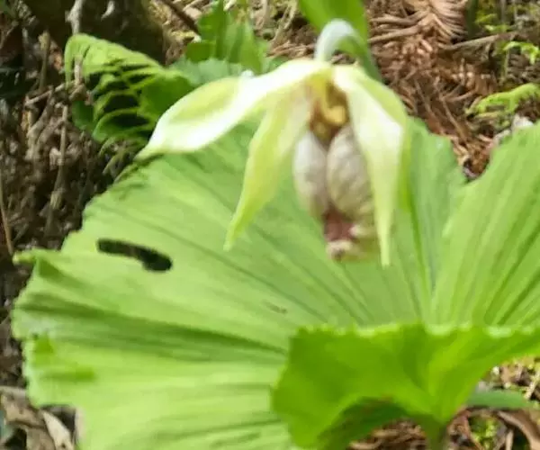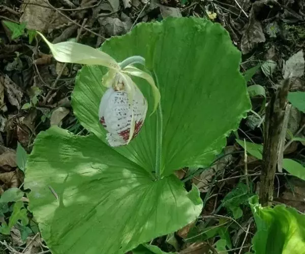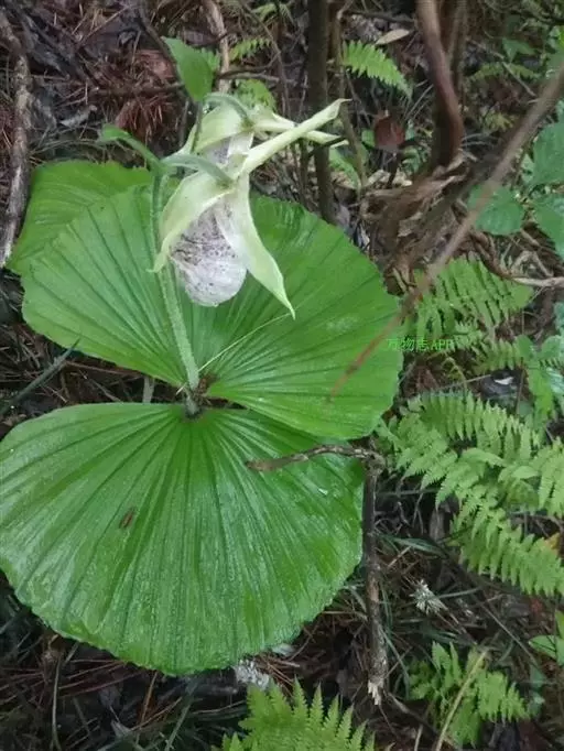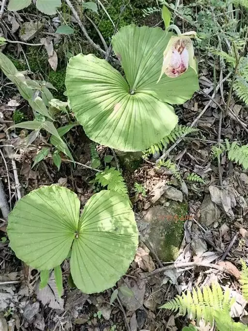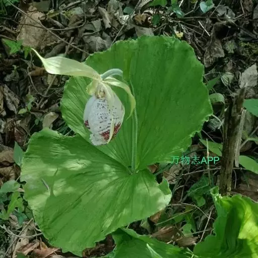 扇脉杓兰(学名:Cypripedium japonicum Thunb.):植株高35-55厘米,具较细长的、横走的根状茎;茎直立,被褐色长柔毛,基部具数枚鞘,顶端生叶。叶通常2枚,近对生,位于植株近中部处,叶片扇形。花序顶生,具1花;花俯垂;萼片和花瓣淡黄绿色,基部多少有紫色斑点,唇瓣淡黄绿色至淡紫白色,多少有紫红色斑点和条纹;花瓣斜披针形,长4-5厘米,宽1-1.2厘米,先端渐尖,内表面基部具长柔毛;唇瓣下垂,囊状,近椭圆形或倒卵形。蒴果近纺锤形,疏被微柔毛。花期4-5月,果期6-10月。