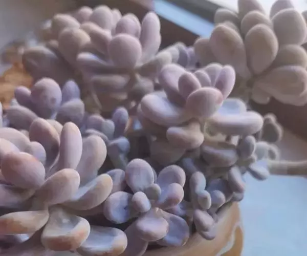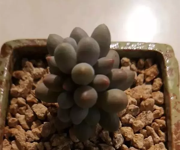 叶片互生,呈螺旋状排列,倒卵形至倒披针形,半圆柱状,先端有急尖,2.2 – 4.5 x 0.8 – 1.3 厘米, 厚6 – 8毫米。一般状态下叶片基部呈粉色,中部呈泛紫的浅灰色至蓝绿色,尖端颜色更浅。 日照时间长且具一定昼夜温差的环境下可呈现较为鲜明的粉红色。