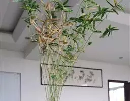 凤尾竹 Raeusch. ex Schult. ’Fernleaf’ R. A. Young)是禾本科,簕竹属孝顺竹的变种。植株较高大,杆高可达6米,竿中空,小枝稍下弯,下部挺直,绿色;竿壁稍薄;节处稍隆起,无毛;叶鞘无毛,纵肋稍隆起,背部具脊;叶耳肾形,边缘具波曲状细长繸毛;叶舌圆拱形,叶片线形,上表面无毛,下表面粉绿而密被短柔毛,小穗含小花,中间小花为两性;外稃两侧稍不对称,长圆状披针形,先端急尖;内稃线形,脊上被短纤毛,花药紫色,子房卵球形,羽毛状。成熟颖果未见。原产中国,华东、华南、西南以至台湾、香港均有栽培。凤尾竹喜温暖、湿润和阳光充足的环境,耐寒。宜土层深厚、肥沃、疏松的微酸性壤土。该种观赏价值较高,宜作庭院丛栽,也可作盆景植物。全草或根入药,味淡、微苦,性寒,有清热利湿、凉血止血、消肿解毒功效,可治痢疾、泄泻等多种病症。凤尾