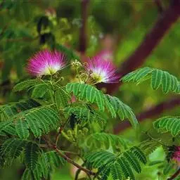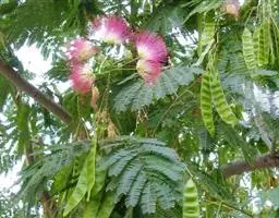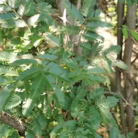 二回羽状复叶,长10-15厘米;总叶柄及叶轴有钩刺4-5列;羽片(4-)7-8对,长2-4厘米;小叶(12)20-30对,线状长圆形,长3-5毫米,宽约1毫米,被白色长柔毛。头状花序花时连花丝直径约1厘米,1或2个生于叶腋,总花梗长5-10毫米;花紫红色,花萼极小,4齿裂;花冠钟状,长2.5毫米,中部以上4瓣裂,外面稍被毛;雄蕊8枚,花丝长为花冠的数倍;子房圆柱状,花柱细长。
